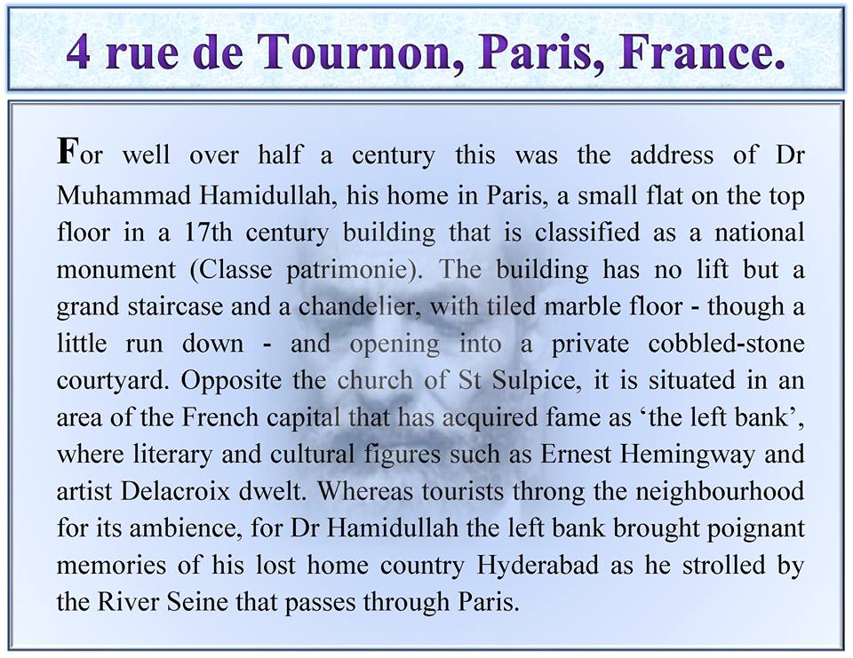 For well over half a century this was the address of Dr. Muhammad Hamidullah, his home in Paris, a small flat on the top floor in a 17th-century building that is classified as a national monument (Classe patrimonie). The building has no lift but a grand staircase and a chandelier, with tiled marble floor – though a little run down – and opening into a private cobbled-stone courtyard. Opposite the church of St Sulpice, it is situated in an area of the French capital that has acquired fame as ‘the left bank’, where literary and cultural figures such as Ernest Hemingway and artist Delacroix dwelt. Whereas tourists throng the neighbourhood for its ambience, for Dr. Hamidullah the left bank brought poignant memories of his lost home country Hyderabad as he strolled by the River Seine that passes through Paris.