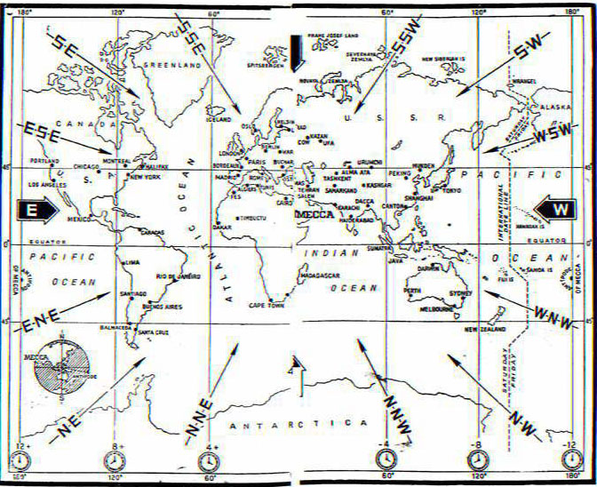 Footnote A : The N.E. direction that is currently popular in North America as a Qibla direction has been calculated using spherical trigonometry. The shortest course between two points on the surface of a sphere is called a “Great Circle Route” and it is the shortest distance if one were to travel on the surface of the earth. With this method, if you were to travel on this curved line, you would continually have to readjust your direction as you traverse the curvature of the earth. This direction has been calculated for North America to be N.E.