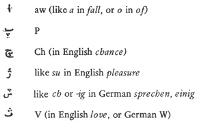 520/d. The following additions are used by and suffice for most of the non-Arabic languages, in the East, such as Persian, Kurdish, Pashto, Urdu, etc., and also in the West. Of these additions, the letters are: