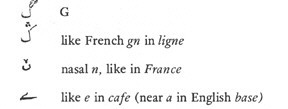 520/e. As an example the following English, French, and German passages are given in both the Latin and Arabic scripts, (to note that final consonants in French words which are not pronounced except when in liaison are underlined):