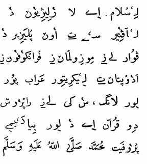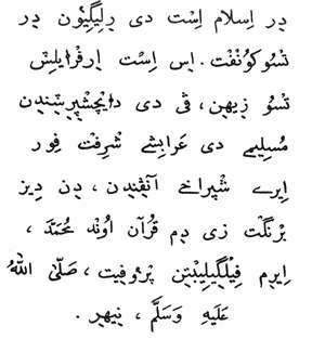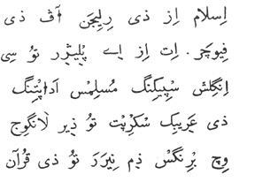 (iii) German: Der Islam ist die religion der Zukunft. Es ist erfreulich zu sehen, wie die Deutsch-sprechenden Muslime die arabische Scrift fuer ihre Sprached anwenden, denn dies bringt sie dem Koran und Muhammad, ihrem vielgelibten Prophet, sal-lal-lahu ‘alaihi wa sal-lam naeher.