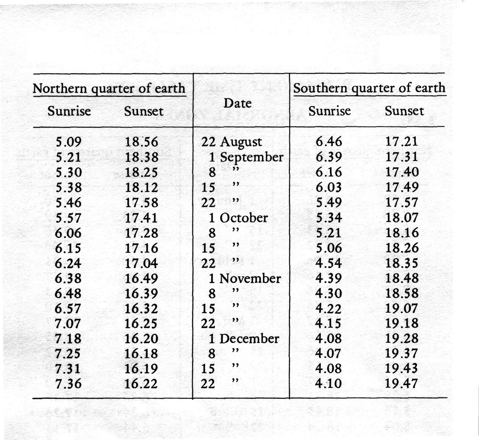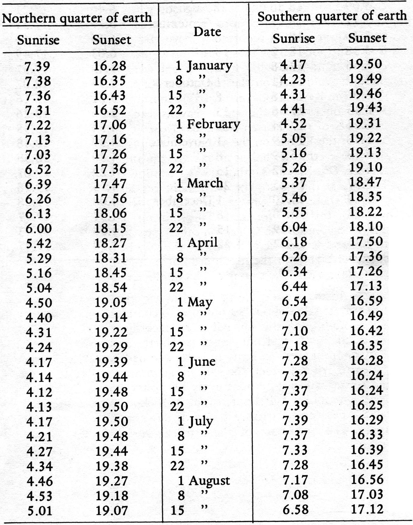 582. Below are given the hours for both 45º North Latitude and 45º South Latitude, in local time. A few words of explanation will be useful: